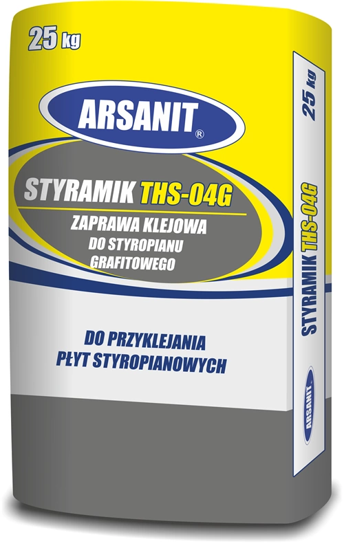 W systemie ociepleń ARSANIT zaprawę klejową STYRAMIK THS-04G stosuje się do przyklejania płyt styropianowych na typowych mineralnych podłożach tj.: cegły, tradycyjne tynki cementowe lub cementowo-wapienne, beton, gazobeton. Zaprawę klejową STYRAMIK THS-04G można stosować do szpachlowania oraz do uzupełniania niewielkich ubytków. Produkt przeznaczony jest do przyklejania styropianowych płyt grafitowych izolacyjnych do zewnętrznych ścian. Zaprawa klejowa THS-04G cechuje się szybkim przyrostem wytrzymałości uniemożliwiający przemieszczanie się płyt pod wpływem ciepła wywołanego promieniowaniem UV, jest zbrojona mikrowłóknami – wzmocniona struktura, do tego jest łatwa w stosowaniu oraz ekonomiczna w użyciu.Marka