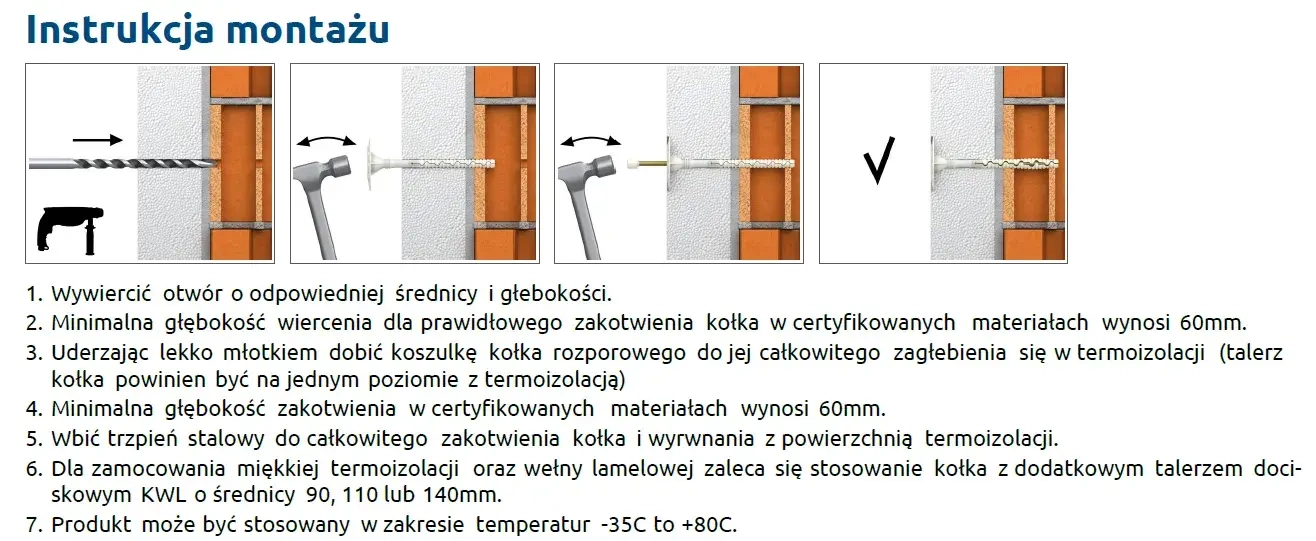 2. Minimalna głębokość wiercenia dla prawidłowego zakotwienia kołka w certyfikowanych materiałach wynosi 60mm.