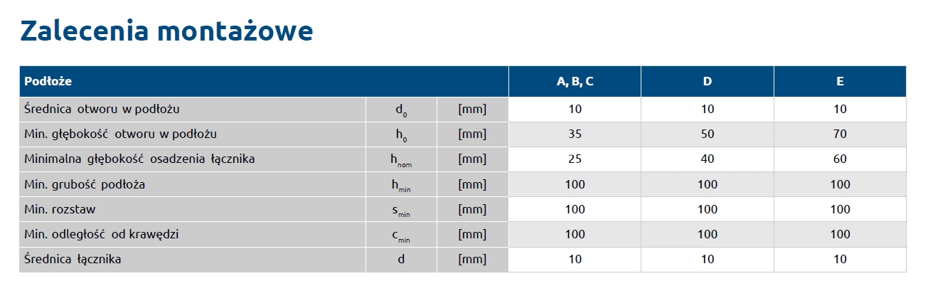 2. Głębokość wiercenia w betonie i cegle pełnej min 35mm, w materiałach otworowych 50mm, w betonie lekkim i gazobetonie