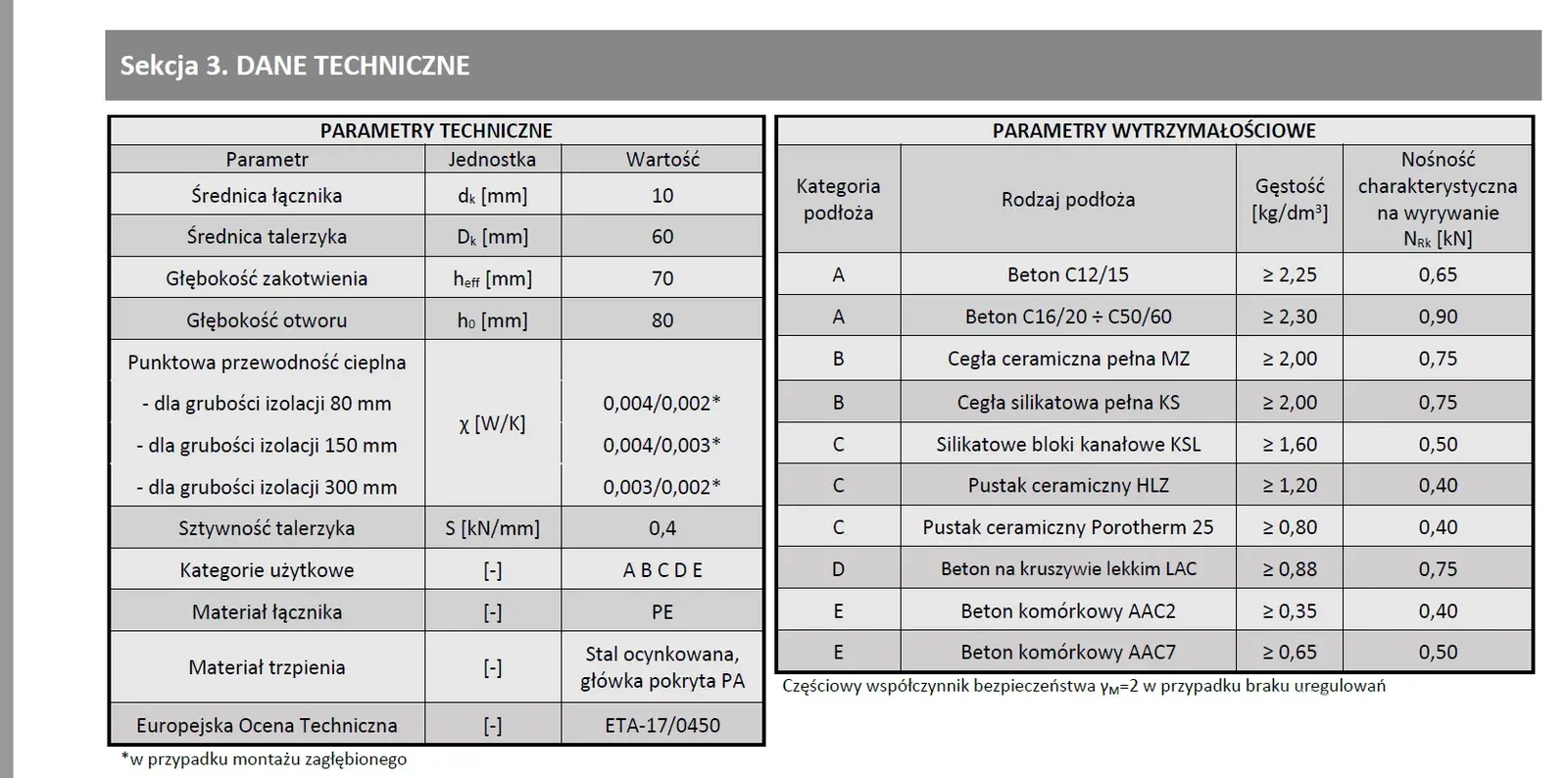 Zanim rozpoczniemy montaż kołków styropianowych LFM LFMG 10x160 powinniśmy rozpoznać podłoże i wybrać odpowiednią długość łącznika. W tym przypadku jest to 160 mm. Pamiętaj, aby uwzględnić minimalną długość łącznika (Ld), która jest równa sumie grubości mocowanej termoizolacji (tfix), warstw wyrównujących (ttol) i głębokości zakotwienia (heff). Przed montażem należy przygotować podłoże zgodnie z instrukcją producenta. Mocujemy płyty termoizolacyjne za pomocą zaprawy klejowej. Musimy się upewnić, że średnica otworów jest zgodna ze średnicą łączników. Otwory w pełnych podłożach powinny być głębsze o 10 mm od głębokości zakotwienia łącznika i czterokrotnie oczyszczone. W podłożach z pustkami wiercimy bez udaru. Ilość łączników na 1 m2 powierzchni ocieplenia jest określona w projekcie zgodnie z Ustawą Prawo Budowlane (Dz. U. 1994 z późniejszymi zmianami).  Orientacyjnie dla styropianu są to: 2 szt./płytę - 4 szt./m2, a dla wełny mineralnej MW - co najmniej 6 szt./m2. Mocujemy łączniki w miejscu, gdzie pokrywają się z zaprawą klejową, osadzamy korpus i wbijamy trzpień. Można je montować w wyfrezowanych otworach (montaż zagłębiony). Po montażu maskujemy miejsce mocowania krążkiem ze styropianu lub wełny mineralnej.