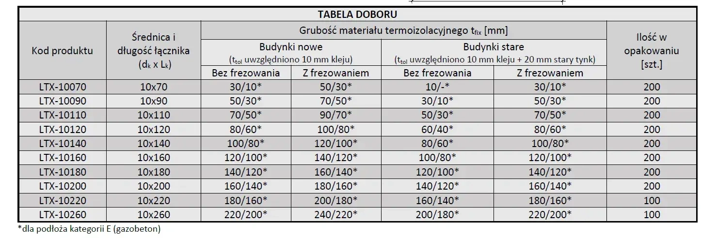 Kołki do mocowania w styropianie LTX 10x260 posiadają szereg zalet. Pierwszą i być może najważniejszą z nich jest nowa, zdecydowanie ulepszona konstrukcja strefy rozpierania. Dzięki niej łączniki mogą być montowane w niemal wszystkich kategoriach podłoży przy zachowaniu wysokich parametrów wytrzymałościowych. Trzpień wzmocniony jest włóknem szklanym, zapewnia dużą wytrzymałość podczas montażu. Konstrukcja główki trzpienia dodatkowo ułatwia montaż. Uszczelnia także połączenie na linii trzpień – koszulka łącznika. Kolejną zaletą jest specjalny kołnierz kołka, a zwiększone usztywnienie talerza dociskowego oznacza pewny docisk przymocowywanego materiału. Warto zwrócić uwagę na innowacyjną konstrukcję koszulki. Duża ilość „kieszeni” klejowych na talerzu dociskowym umożliwia większą przyczepność zaprawy klejowej.